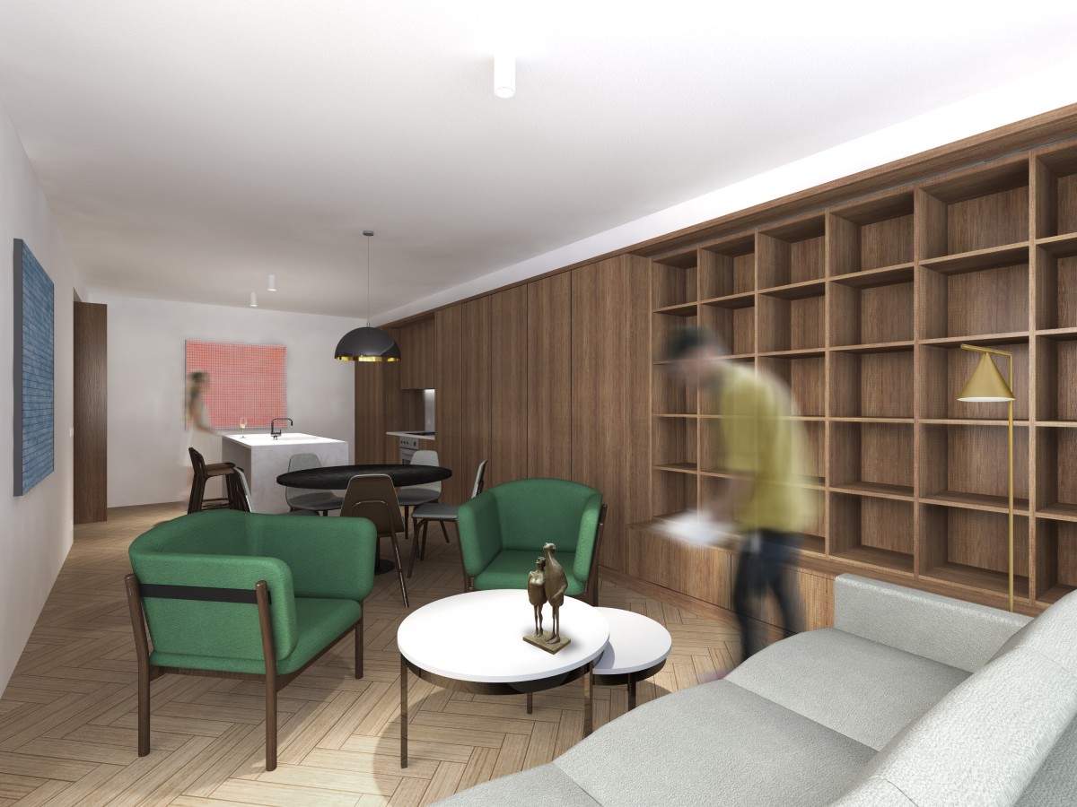 Projekt řeší klientské změny dispozice bytu spolu s návrhem interiéru, výběr mobiliáře a dílčí výkresy vestavěného nábytku. Návrh se snaží řešit dostatek úložných prostor formou chodbových šaten, prázdné chodby jsou tak chytře využity. Dispozice je kultivována a vhodně upravena. Samotný rozvrh nábytku se snaží o maximální využitelnost prostoru bytu a tvarů jednotlivých místností, logicky doplňuje provoz. Výrazová univerzalita a jednoduchost vestavěných truhlářských výrobků dává možnost vyniknout solitérům a především se snáze kombinuje s novými částmi volného mobiliáře.