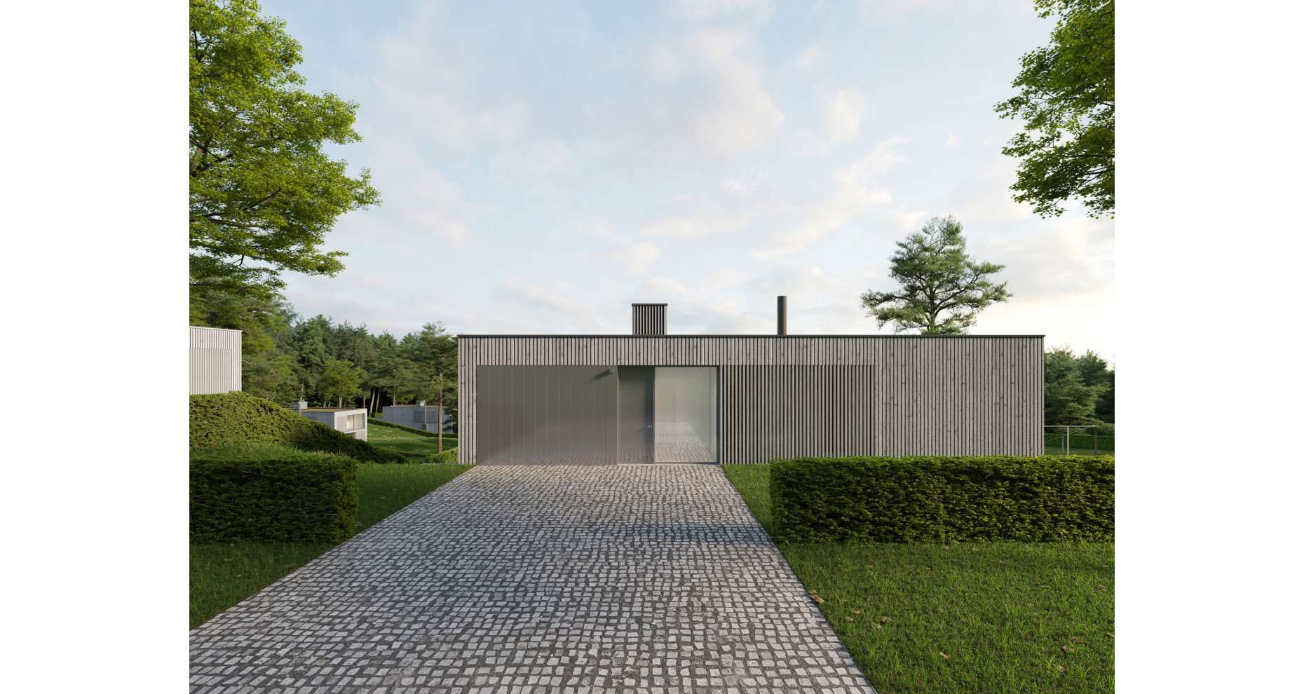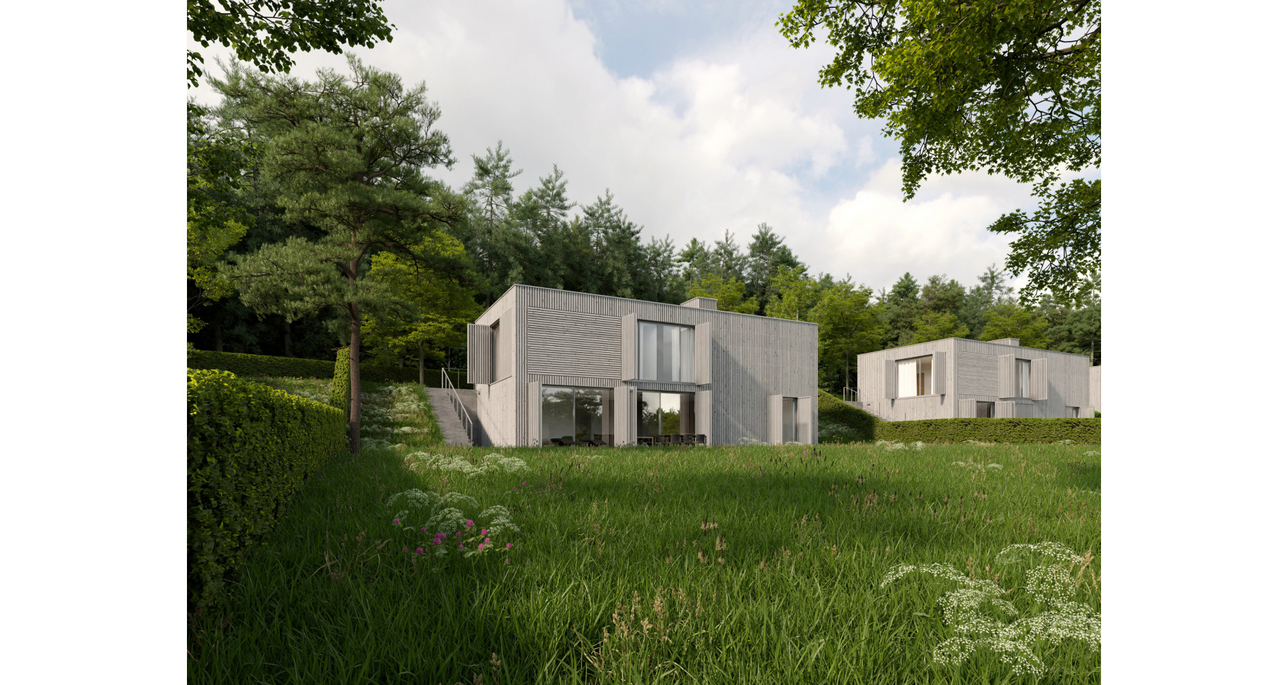 Z hlediska rodinných domů se u obou typů jedná o stejné východisko, vycházející zejména z požadavků investora na plošné a dispoziční využití, dále pak objemově domy přizpůsobit měřítku domů v okolí a také domy vhodně osadit do svahovitého pozemku. Koncepčně tedy oba typy domů pracují s podobným dispozičním schématem, které víceméně vychází ze stejných podmínek, tedy částečného zapuštění domů do svahu, a tedy řešení příjezdu a příchodu do domů na úrovni 2.NP, které je tak z komunikace jako jediné přístupné. Pojmout tedy 2.NP jako podkroví je z hlediska využitelnosti krajně nevhodné, a základní koncepce tedy od počátku uvažuje s domy s plochou ozeleněnou střechou. Díky zapuštění do terénu tedy domy v uličním profilu vyhlíží nenápadně, jsou jednopodlažní, a otevírají se plně oběma podlažími směrem po svahu do velkorysých zahrad s výhledem do lesa či ke společnému jezeru. Se svahovitostí jak ve směru zahrad, tak ve směru komunikace (platí jak pro „horní“ domy TYP A, tak i pro „spodní“ domy TYP B), souvisí adekvátní zemní práce a následné terénní úpravy, které mají mezi jednotlivými domy zajistit jak přirozeně konfigurovaný terén, tak i pohodlný příchod a příjezd do domu a dále pak na úrovni 1.NP i částečnou rovinu pro osazení terasy a předprostoru před domem.